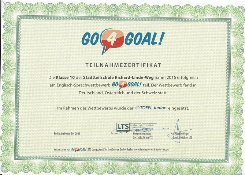 Im Rahmen des Wettbewerbs „Go4Goal“ hat der Sek II – Kurs des Jahrgangs 10 in diesem Schuljahr den TOEFL Junior durchgeführt. Die Kosten für die Testung wurden von der Schule übernommen. Jeder Schüler erhielt einen Ergebnisbericht, „score report“, der ihnen zeigt, in welchem Bereich des GER (Gemeinsamer Europäischer Referenzrahmen) sie sich mit ihrem Sprachniveau befinden. Stärken und Schwächen in den Bereichen Lesen, Grammatik und Hören wurden den Schülern aufgezeigt, so dass sie sich nun auch in Hinblick auf die Oberstufe, individuell vorbereiten können. Auch im nächsten Schuljahr soll der Sek II – Kurs des Jahrgangs 10 am TOEFL Junior teilnehmen.